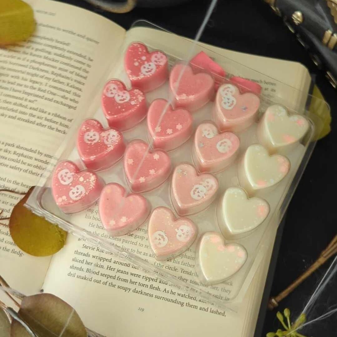 Whoever said Halloween couldn't be cute clearly hasn't met our pastel pink heart-shaped wax melts. Within this delightful clamshell, you'll find 16 beautifully crafted melts, each infused with one of our four spooky yet charming scents.