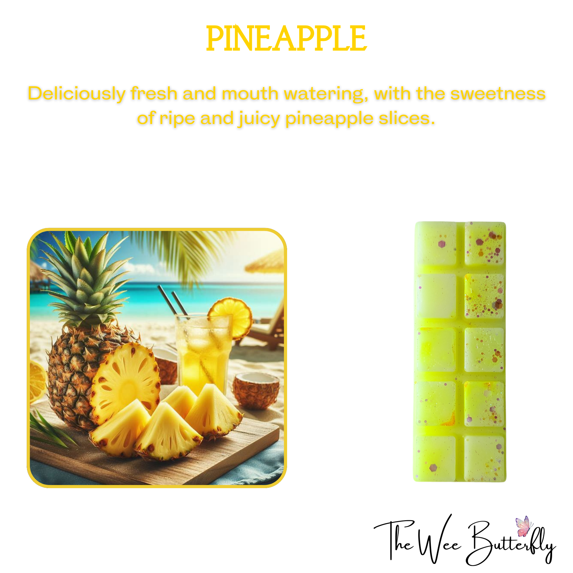 Our pineapple fragrance oil is a deliciously fresh, mouth watering, sweetness of ripe and juicy pineapple slices.