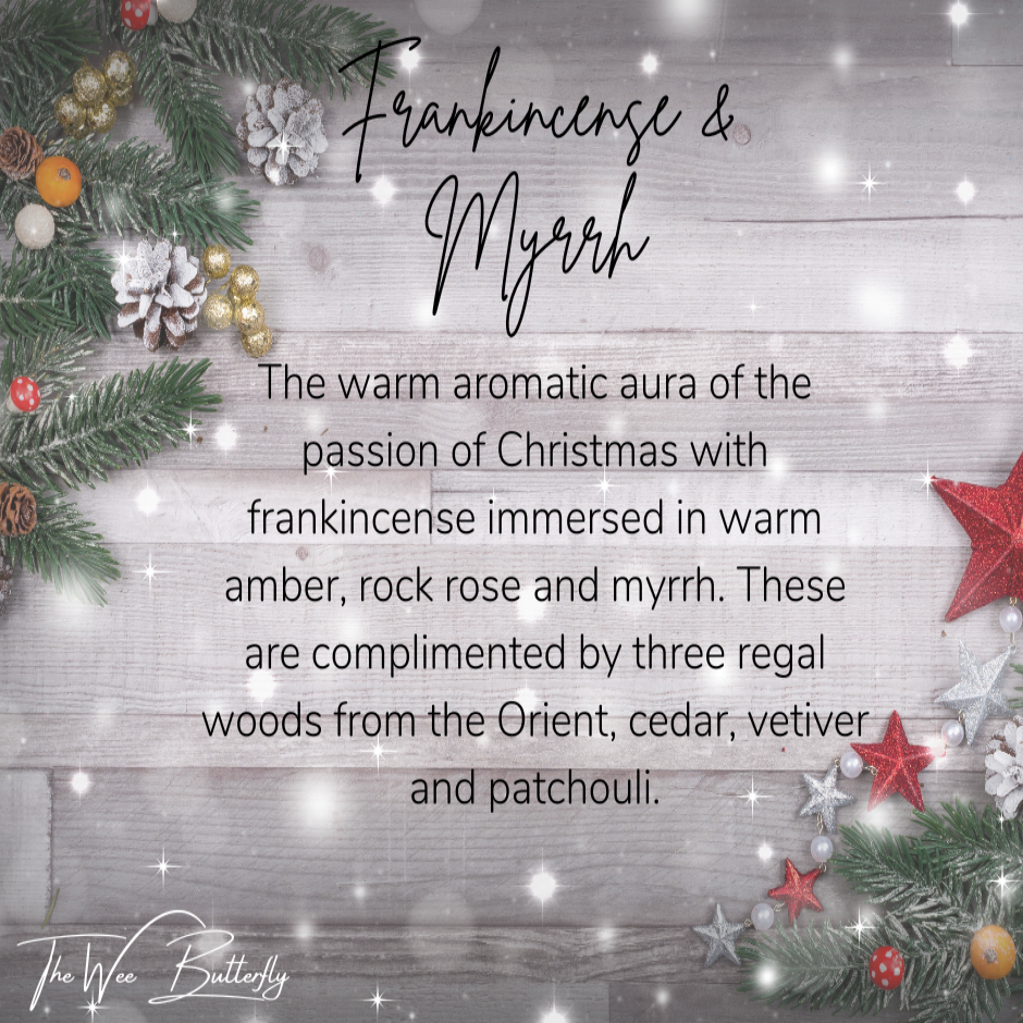 The warm aromatic aura of the passion of Christmas with frankincense immersed in warm amber, rock rose and myrrh. These are complimented by three regal woods from the Orient, cedar, vetiver and patchouli.